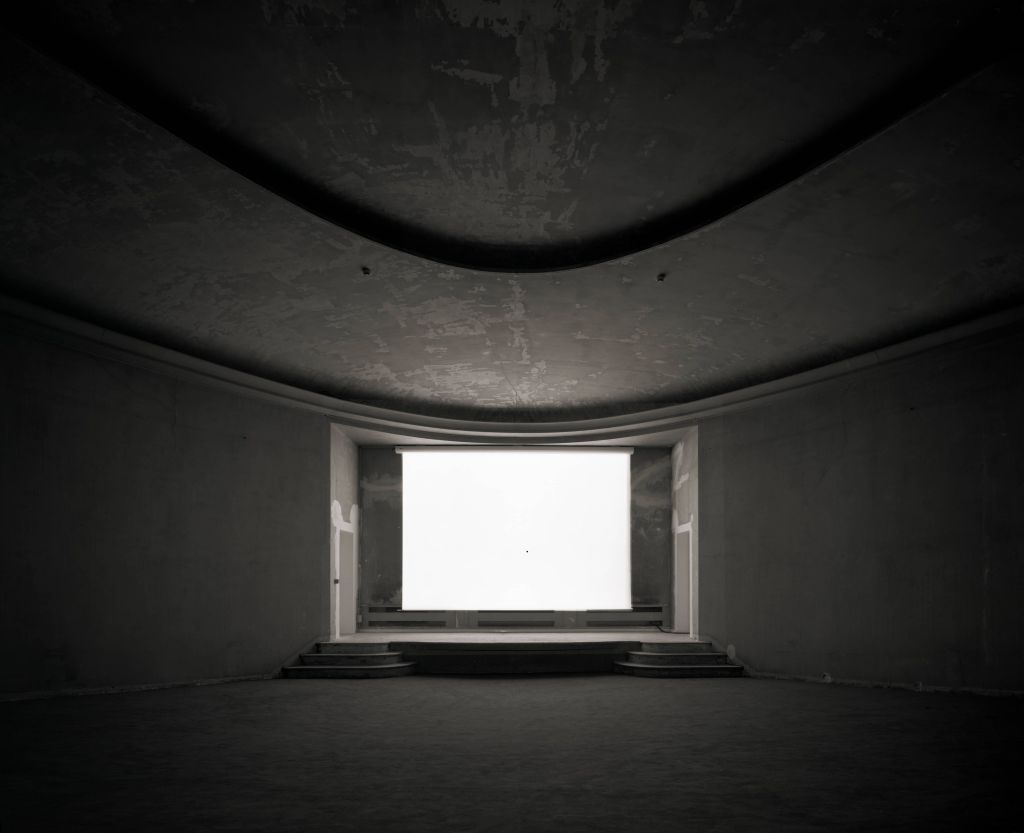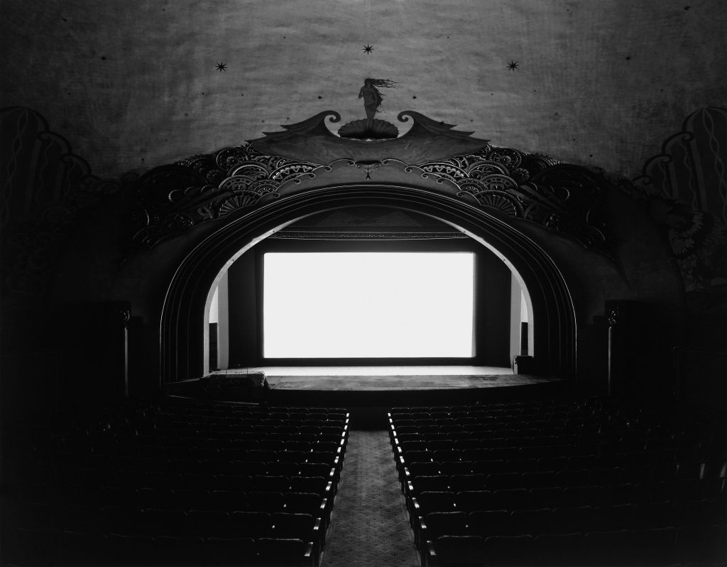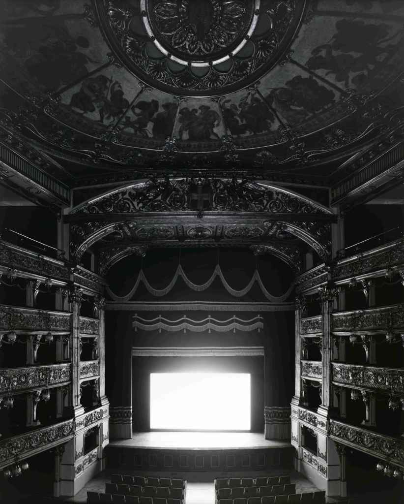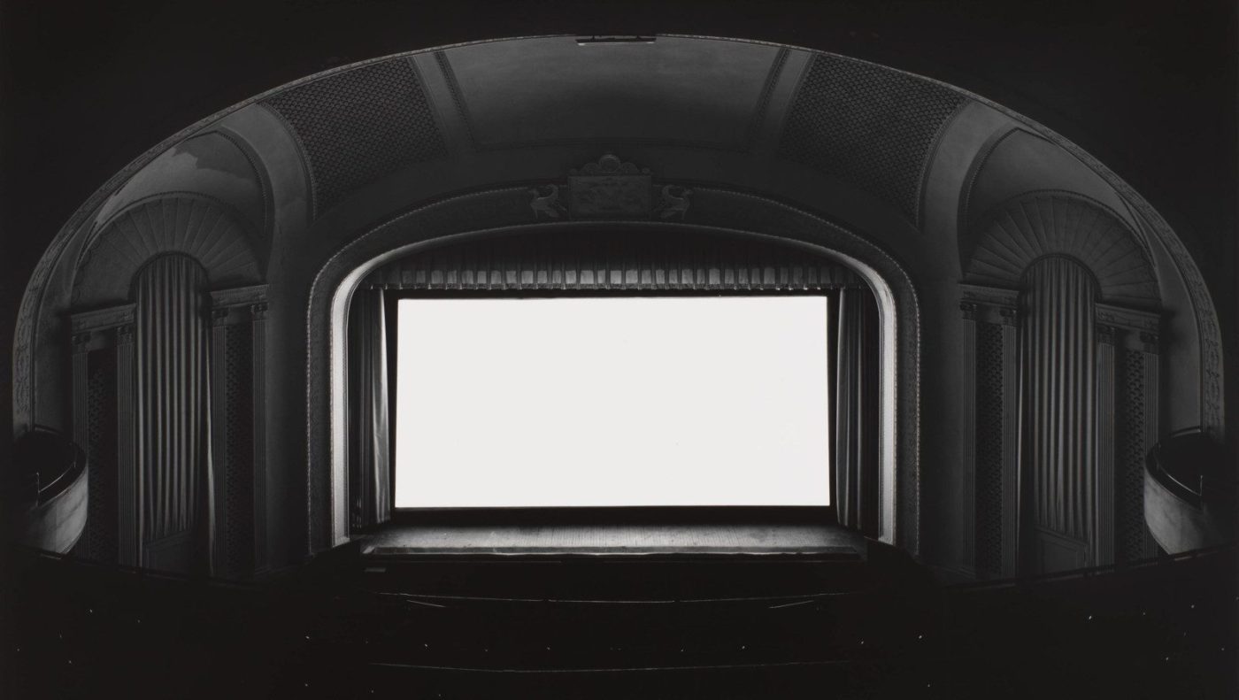 HIROSHI SUGIMOTO, Theaters. Iniziata nel 1976 e proseguita fino al 1998, la serie Theaters nacque dall’idea di fotografare i film proiettati in sale degli anni ’20 e ’30, drive-in e cinema degli anni ’50, con tempi di esposizione pari alla durata dei film stessi. Sugimoto ricominciò la serie dedicata ai cinema storici nel 2013, dopo aver visitato il Cinema Odeon di Firenze.