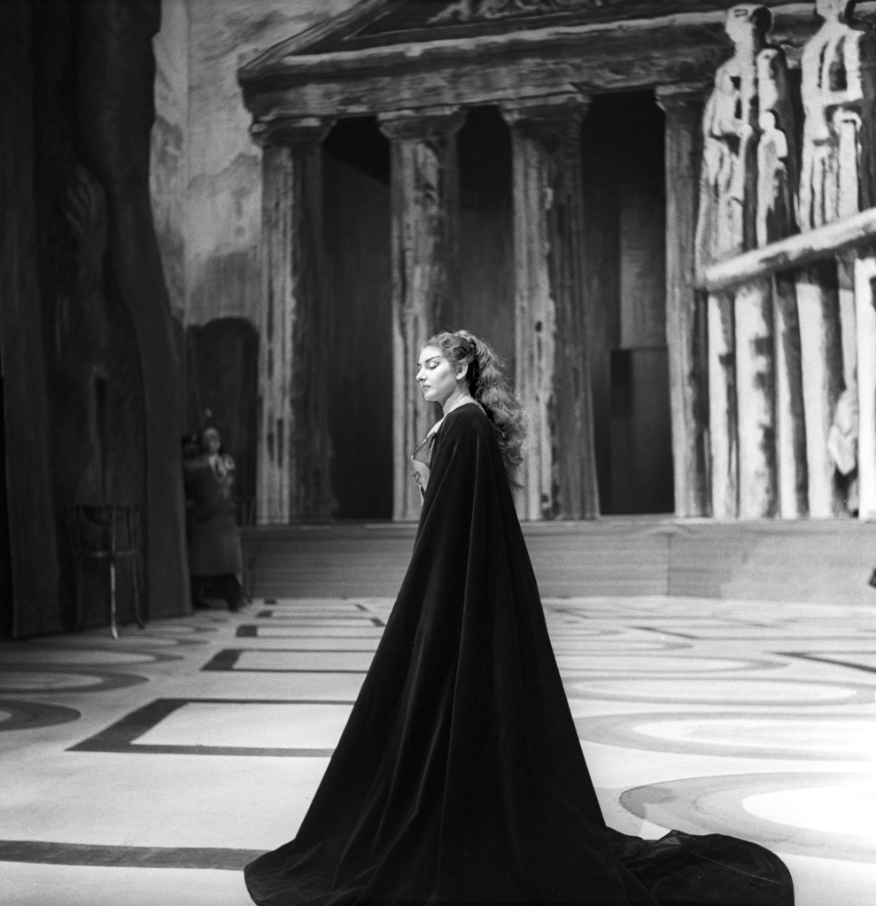 Sembra affiorare da un’ombra, da un frammento della notte: il lungo e scuro mantello la avvolge per intero cancellando le linee del corpo, scoprendo solo il bianco volto mediterraneo, enfatizzato dalla folta chioma arcaicizzante e dalle rovine greche sullo sfondo – plastici di templi antichi che la regista Margarete Wallmann ha voluto per la messinscena della Medea di Luigi Cherubini, qui diretta da Leonard Bernstein. Non sappiamo per certo se sia stato Erio Piccagliani a scattare questa fotografia, il 10 dicembre 1953, un attimo prima dell’inizio dello spettacolo, ma sappiamo quel che lo spettacolo avrebbe prodotto: il turbamento, l’ammirazione, più di tutto la consacrazione di Maria Callas, presto soprannominata «la Divina», come una delle voci più prodigiose del secolo.