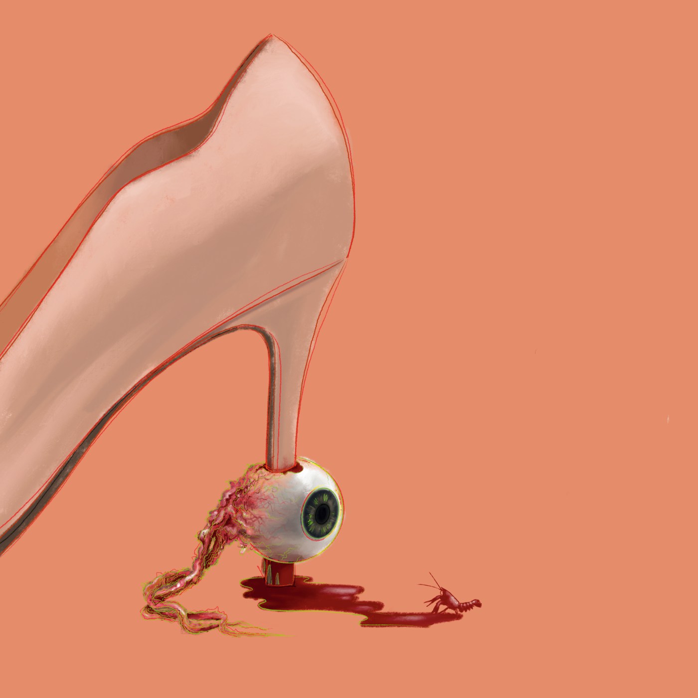 Non ci vedo letteralmente più. È buio viscido e si prende gli occhi. Mi sento qualcosa negli occhi. Una puntura, un ago, un granello infinitesimale di polvere che sta lì e per quanto io lacrimi non va via. Nelle orecchie parte un fischio che sale e mi martella i timpani. Senza sapere né come né perché adatto quel fischio e nella mia testa parte Ray of Light di Madonna. È un vortice. Nella mia mano destra c’è il mio stiletto nude e urlo. Lo sento affondare e quando affonda torno a vedere il tempo di un attimo. Si è conficcato nell’occhio destro del mio capo. Io l’ho conficcato nell’occhio destro del mio capo. Il tacco affonda, e più affonda, più la sostanza bianchiccia si ingrossa, minaccia di uscire dall’intercapedine delle palpebre. Lo sfilo via e gli martello di nuovo la faccia. L’occhio gli sta diventando rosso. Il sangue gli si raggruma lì sotto, spinge e scalpita per uscire finché non gli faccio esplodere una guancia. Sgorga uno schizzo prorompente che sa di caldo, ferroso che mi inonda al ritmo del battito del suo cuore. Mi lorda diretto in faccia il suo fluido più prezioso. E più ci sprofondo, più ne voglio. Mi accanisco. E non c’è osso di quel cranio che regga alla ferocia del mio stiletto numero trentasette e mezzo. Se lui soffre non ha il tempo di lasciarlo a vedere, il tacco affonda finché non ci ritrovo brandelli del suo cervello che saltellano e iniziano a raggrumarsi, contro la suola. E io continuo, continuo anche quando il suo corpo si accascia a terra e io gli salgo sopra, come un’odalisca, una valchiria. Sono invincibile. La pelle si squarcia, mi ricorda le case sventrate che disegnavo quando ero bambina e non avevo giocattoli con cui passare il tempo. Gli deformo la faccia al punto tale che l’occhio gli ciondola via. Solo in quel momento riprendo fiato. C’è un filamento che lo lega al cranio. Ci infilo il dito, lo attorciglio come farei con una ciocca di capelli, lo stacco e salta come un elastico. Lo mangio. E mentre lo mangio mi accorgo di avere un brufolo sul dorso della mano sinistra. Lo gratto via, lo spremo. L’eruzione di pus non finisce lì, e più gratto, più mi rendo conto che lì sotto c’è qualcosa. Gratto, allargo la pelle, devo tirarne via un pezzo che si allunga sempre più finché non estraggo un dente – è uno dei miei canini. Panico. La lingua si solleva, batte lì dove la gengiva testimonia la sua assenza. Sento il sapore del sangue, gli ultimi rimasugli dell’occhio che ho ingoiato.