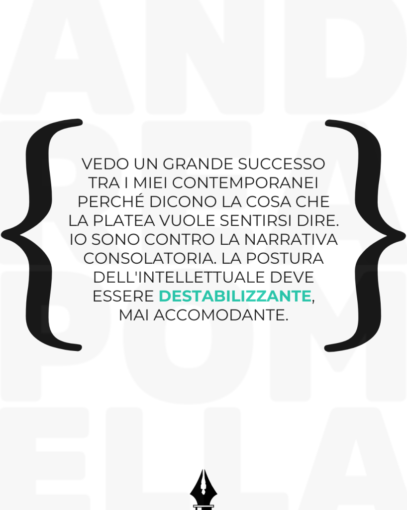 Se provo a pormi io come filtro educativo penso: siamo messi male. Io non devo e non voglio ricoprire questo ruolo. Questo non toglie che io sia una mente pensante e abbia delle opinioni che possa esprimere in diverse sedi. Chi si arroga il diritto di essere educatore mediante la propria arte magari è lo stesso che parte a scrivere pensando già di vincere lo Strega.